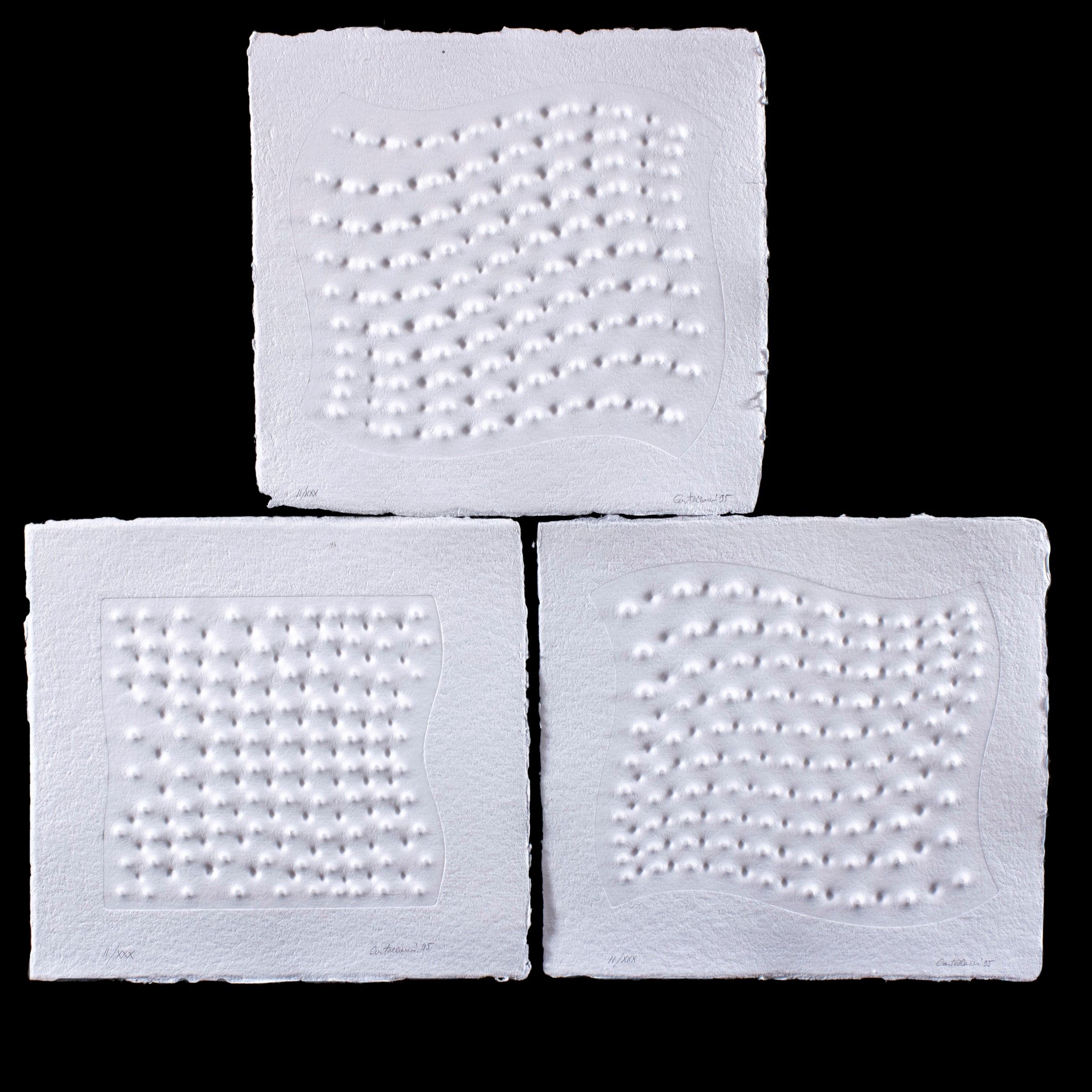 Castelmassa 1930 - Viterbo 2017 'Superficie I - Superficie II - Superficie III', 1995, tre rilievi eseguiti con impressione a secco su carta, es. II/III, firmati e datati a matita in basso a destra. Opere realizzate per accompagnare i primi 30 esemplari del volume Enrico Castellani Opera Grafica 1960 - 1995, entro custodia originale in cartone contenente anche il volume citato. Bibliografia: L. Magini (a cura di), Enrico Castellani opera grafica 1960-1995, Corraini Editore, Mantova 1995, immagini n. 47- n. 48 - n. 49