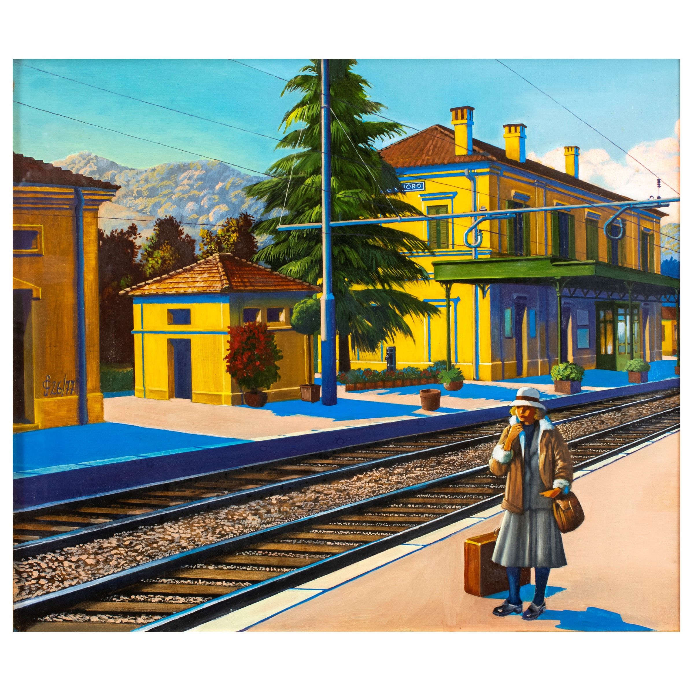 Roma 1935 'Stazione di provincia VII', 1977, olio su tela, siglato e datato a sinistra, firmato, datato e titolato sul retro, entro cornice