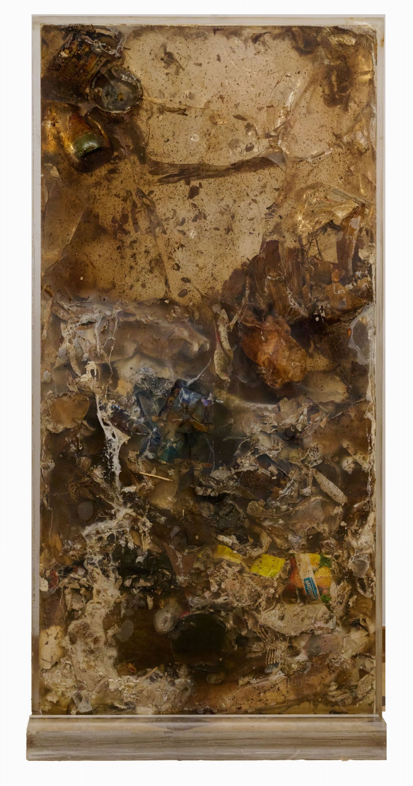 Accumulo di rifiuti e rifiuti bruciati in resina, racchiuso in plexiglas, cm. 101x50x11