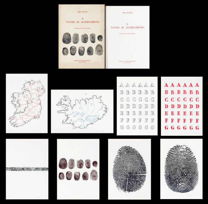 Ciascuna 49 6x34 7 litografia es. 26/60 Ciascuna litografia firmata e datata in basso a destra e numerata in basso a sinistra a matita Prefazione di Vincenzo Agnetti. Cartella con 8 tavole originali firmate di Piero Manzoni tirate dalla Società Fotolitografica per le Edizioni di Vanni Scheiwiller in 60 esemplari numerati da 1 a 60. È stata finita di stampare nell'ottobre 1961 ed edita un anno dopo in Milano.