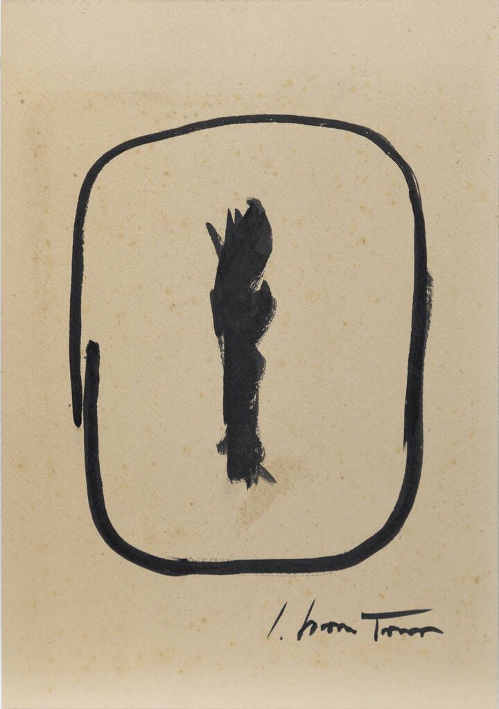 28x19 5 china nera su cartoncino Opera firmata in basso a destra Opera registrata presso la Fondazione Lucio Fontana Milano con n. 4520/1 (certificato su fotografia) Esp.: 1968 Milano Studio Architetto Bellini Mostra Panorama 5 immagine Fantastica (etichetta al retro con data dell'opera) Fioriture della carta