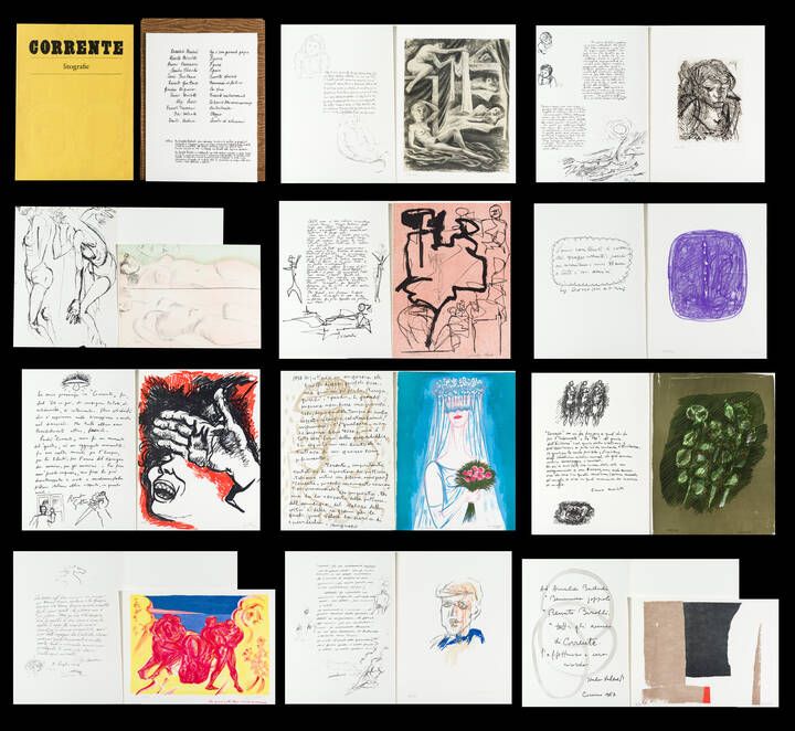 Ciascuna 47 5x36 litografia es. 127/150 Ciascuna firmata in basso a destra e numerata in basso a sinistra Cartella di 12 litografie di autori vari edita da Teodorani Editore (Grafica ST) Milano dicembre 1967. Quest'opera è stata interamente tirata sui torchi della Grafica ST in numero di 150 esemplari più un esemplare ad personam riservato a ciasun artista all'autore all'editore. Gli autori sono: Arnaldo Badodi Renato Birolli Bruno Cassinari Sandro Cherchi Lucio Fontana Renato Guttuso Giuseppe Migneco Ennio Morlotti Aligi Sassu Ernesto Treccani Italo Valenti Emilio Vedova