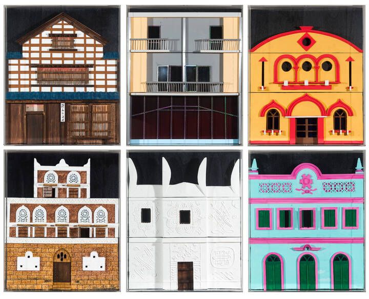 61x51 (teca) sei modelli di architetture etniche entro teca in plexiglass Tre teche firmate datate e intitolate al retro: etnia araba etnia slava etnia latino-americana Trattasi di parte di installazione. Uno dei modelli presenta una piccola rottura. Bibl.:-M. Vescovo (a cura di) Gilardi-Fogliati-Faure 'Pas de trois': ibridazioni tra arte e scienza Gas Artgallery Torino 24 marzo-8 maggio 2004/Centre Culturel Francais de Turin Torino 30 marzo-8 maggio 2004 ripr. (solo 5 modelli) a colori al n. 5 p. 17