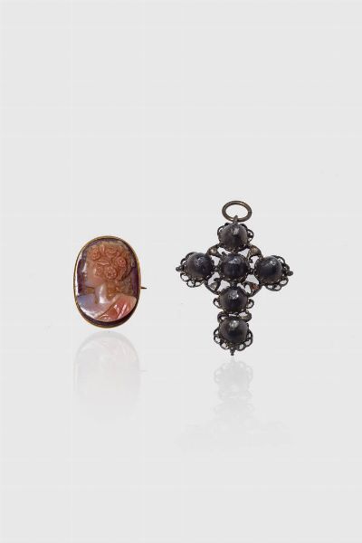 -ciondolo in argento XVIII secolo con rosette di diamanti. Peso gr 11 6 -spilla in oro giallo con cammeo con profilo virile. Peso gr 6 4. Cm 2 5x1 4