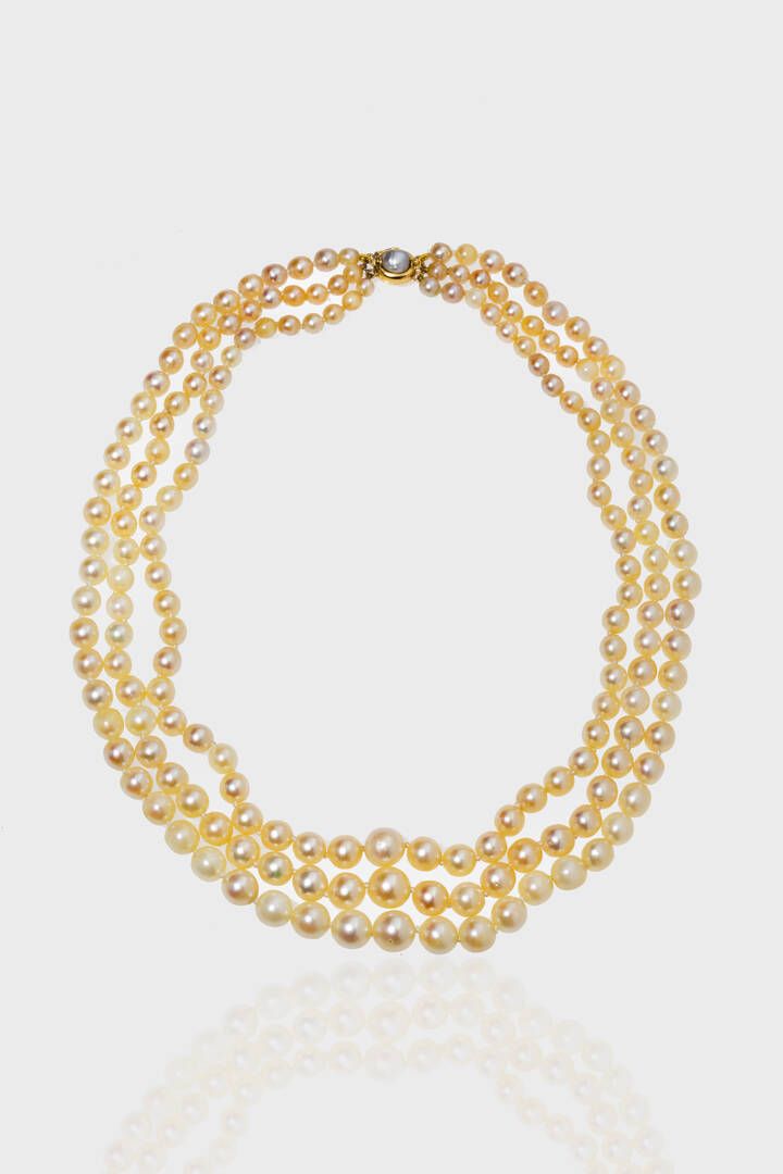 Lunghezza cm 40 composto da tre fili di perle giapponesi a scalare dal diam. di mm 5 a 8 8. Chiusura in oro giallo con perla.