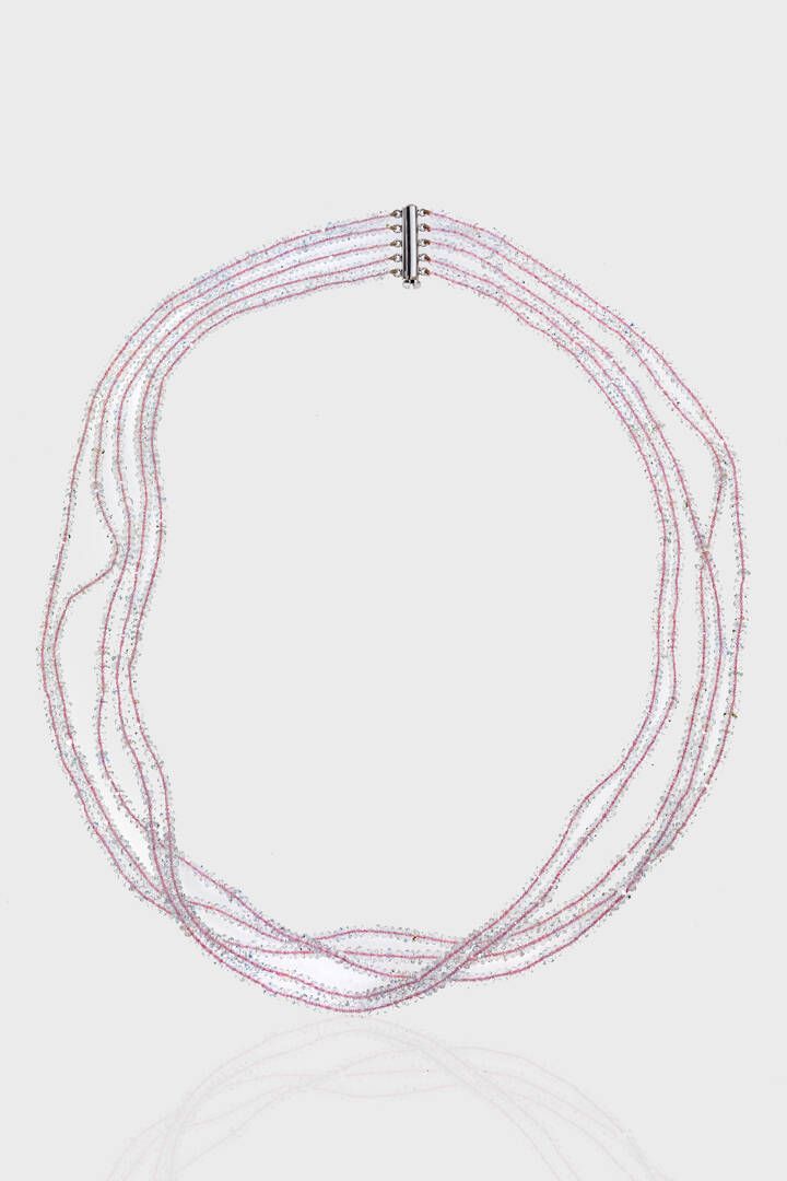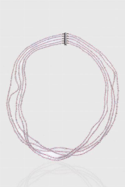 Lunghezza cm 63 composto da cinque fili di dischi briolette di morganite rosa. Chiusura in oro bianco.