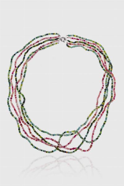 Lunghezza cm 65 composto da cinque fili di dischi di tormaline verdi e rosa. Chiusura in argento ad anello.