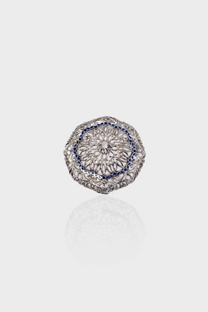 Peso gr 11 9 Diam. cm 3 5 in oro bianco anni '50 di forma rotonda interamente traforata; decori in smalto blu e diamanti taglio brillante e 8/8 per totali ct 0 18 ca