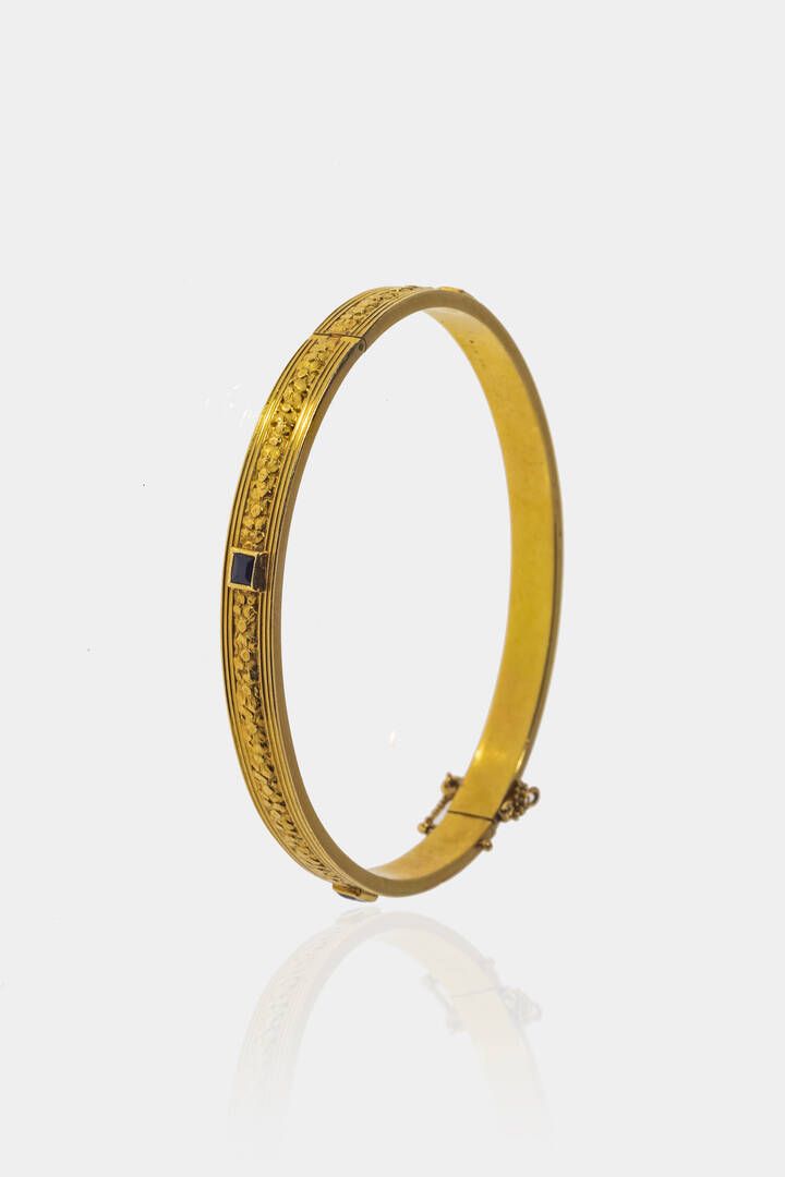 Peso gr 15 6 rigido in oro giallo 14 Kt anni '30 parte centrale lavorata a motivo floreale e quattro zaffiri sintetici a decoro.
