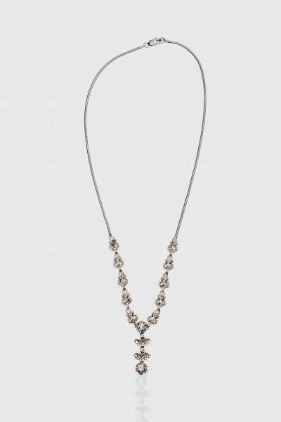 Peso gr 18 5 Lunghezza cm 44 in oro bianco; maglia a coda di topo anni '50 al centro fiori con diamantini taglio brillante e 8/8 per totali ct 0 55 ca