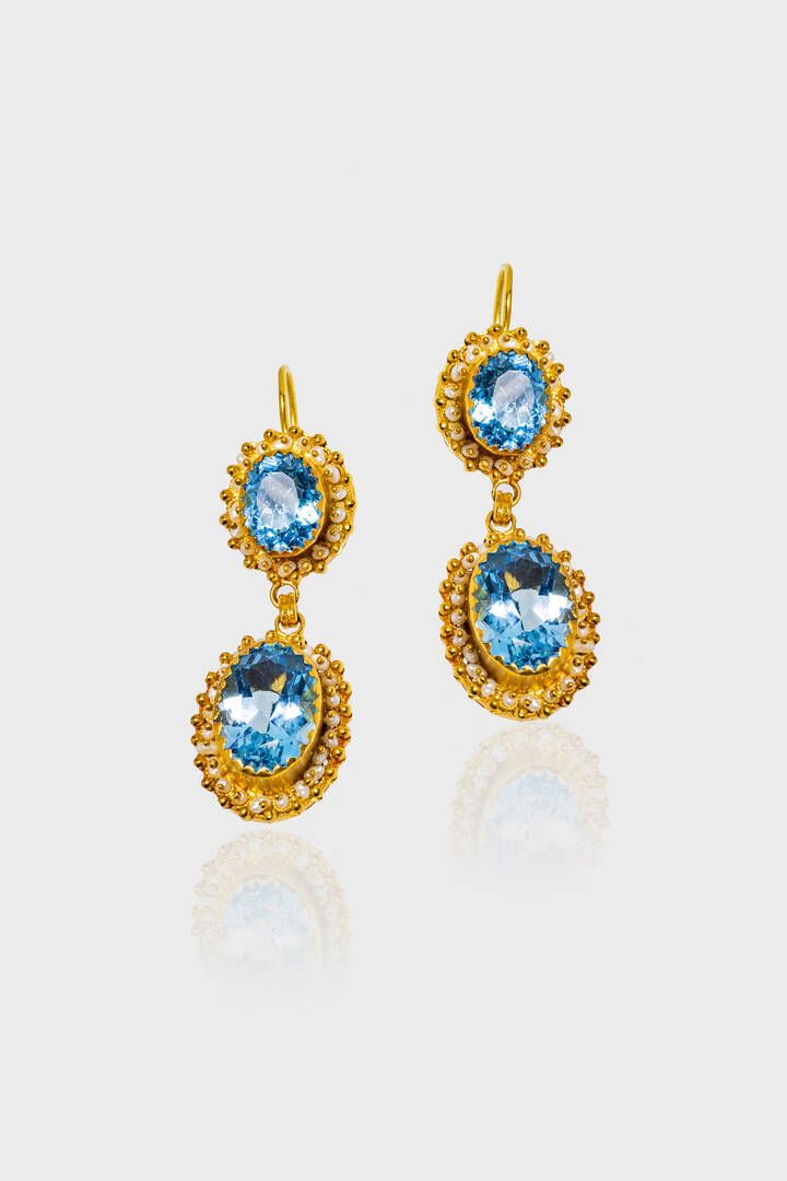 Peso gr 18 in oro giallo a monachella con al centro topazi azzurri taglio ovale e perline a decoro