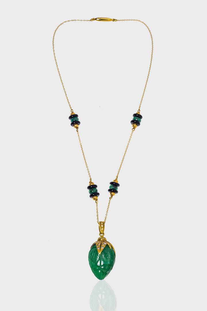 Peso gr 21 4 in oro giallo con grande smeraldo inciso a bocciolo di ct 50 ca; diamanti taglio brillante di colore bianco e giallo a decoro per totali ct 1 0 ca. Catena con dischi in onice e sfere di smeraldo.