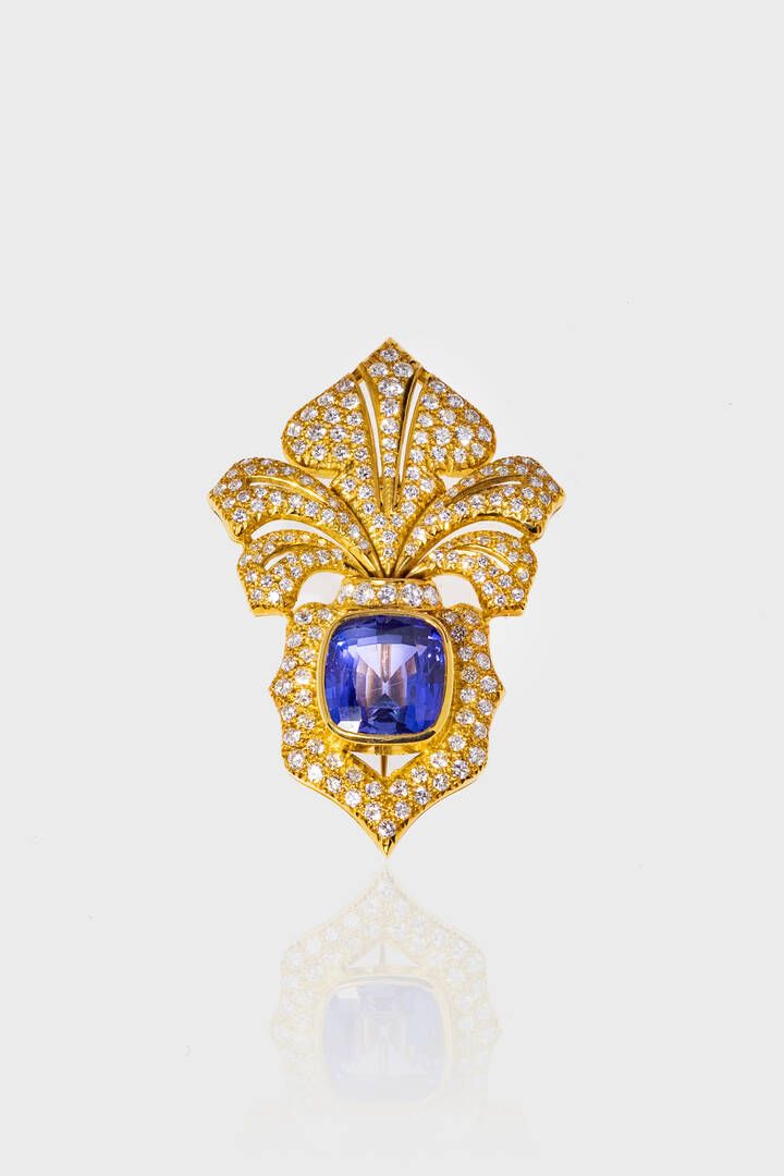 Peso gr 29 7 Lunghezza cm 6x4 in oro giallo con al centro grande tanzanite taglio cuscino di ct 7 50 ca e diamanti taglio brillante per totali ct 3 50 ca probabile colore G-H purezza IF-VVS