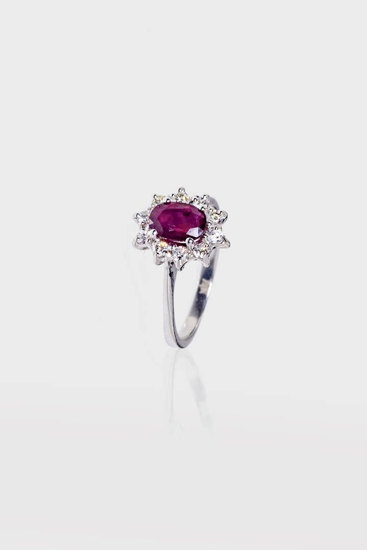 Peso gr 3 3 Misura 14 (54) in oro bianco sommità a margherita con rubino taglio ovale ct 0 90 ca e contorno di diamanti taglio brillante per totali ct 0 35 ca.