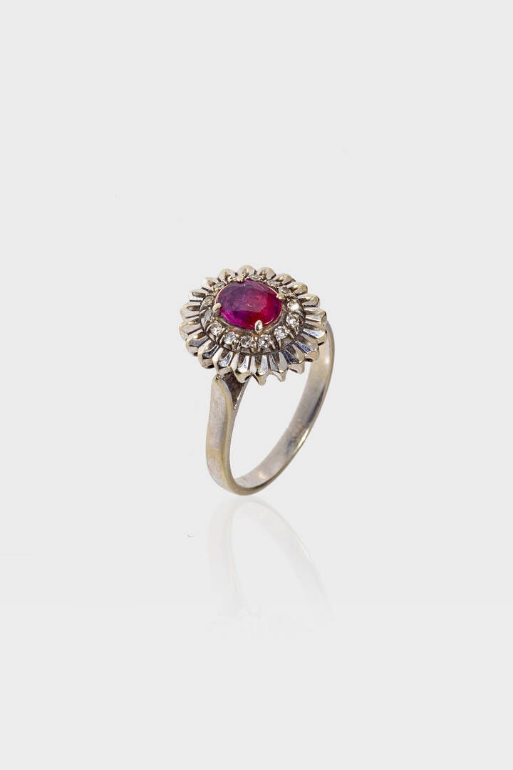 Peso gr 3 7 Misura 12 (52) in oro bianco sommità con al centro rubino taglio ovale di ct 0 80 ca contornato da diamanti taglio 8/8 per totali ct 0 10 ca