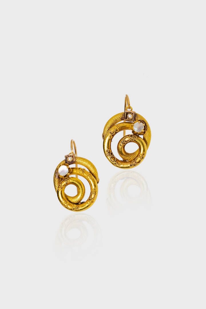 Peso gr 3 8 in oro giallo XIX secolo lavorati a canna vuota a forma di serpenti intrecciati e madreperla.