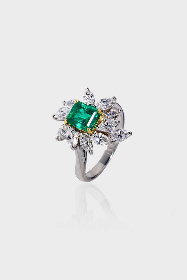 Peso gr 5 9 Misura 14 854) in oro bianco sommità a margherita con al centro smeraldo Colombiano taglio carré di ct 1 07 ca e diamanti taglio navette per totali ct 1 38 ca probabile colore G-H purezza VS.