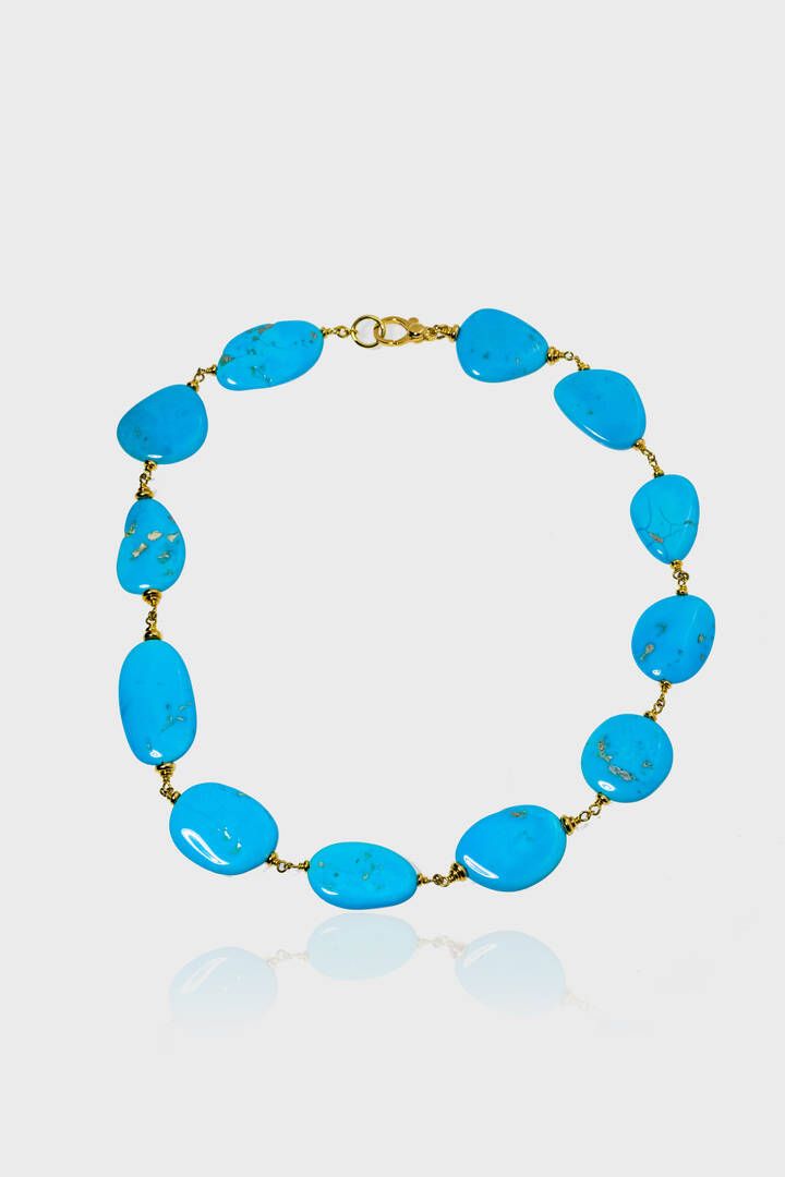 Peso gr 54 1 Lunghezza cm 40 composto da pepite appiattite di turchesi. Distanziali e chiusura in oro giallo.