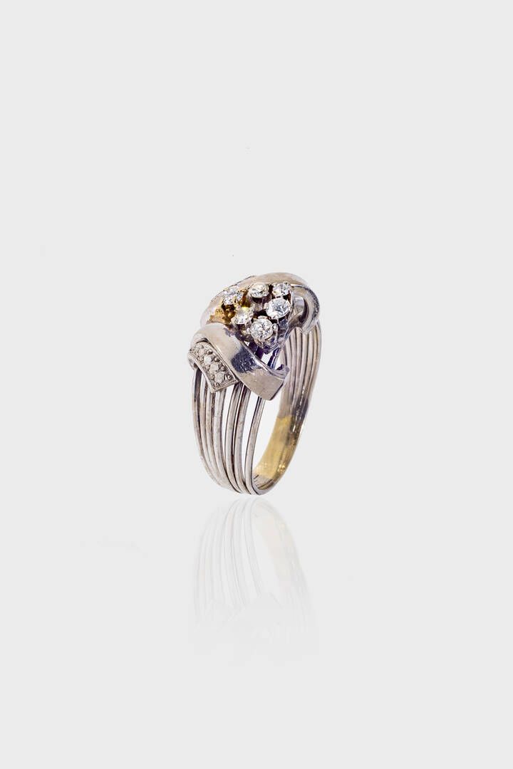 Peso gr 7 1 Misura 22 (62) in oro bianco sommità a voluta con diamanti taglio brillante di vecchio taglio per totali ct 0 20 ca.