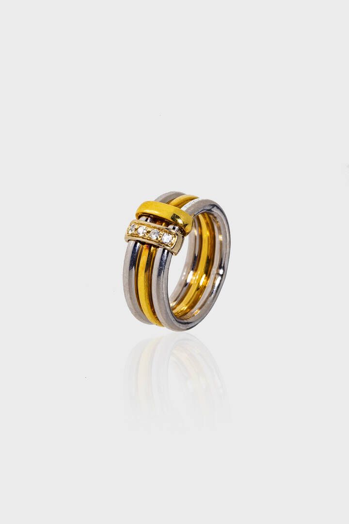 Peso gr 7 3 Misura 11 (51) composto da tre fasce in oro giallo e bianco(ammaccature) al centro quattro diamanti taglio brillante per totali ct 0 05 ca