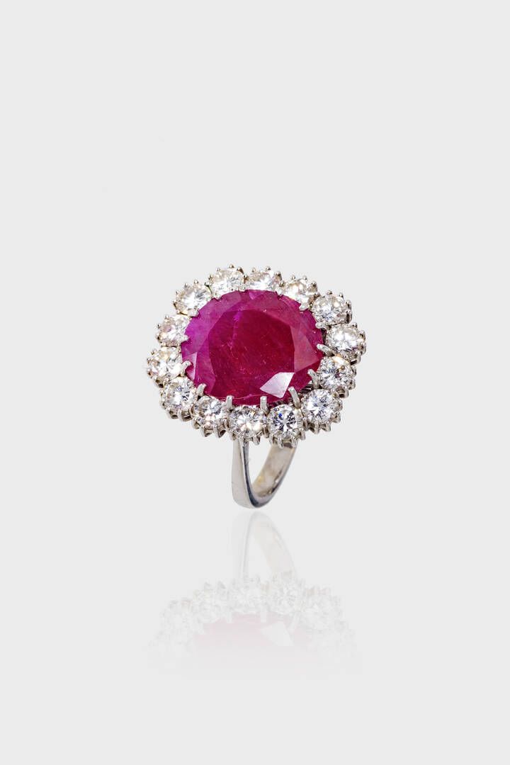 Peso gr 8 5 Misura 19 (59) in oro bianco sommità a margherita al centro grande rubino taglio ovale di ct 8 0 ca contornato da diamanti taglio brillante per totali ct 2 0 ca