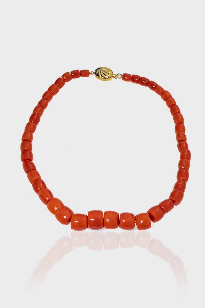 Peso gr 90 8 Lunghezza cm 47 composta da un filo di barilotti a scalare di corallo rosso mediterraneo dal diam. di mm 7 5 a 16 ca. Chiusura in oro giallo 9 Kt.
