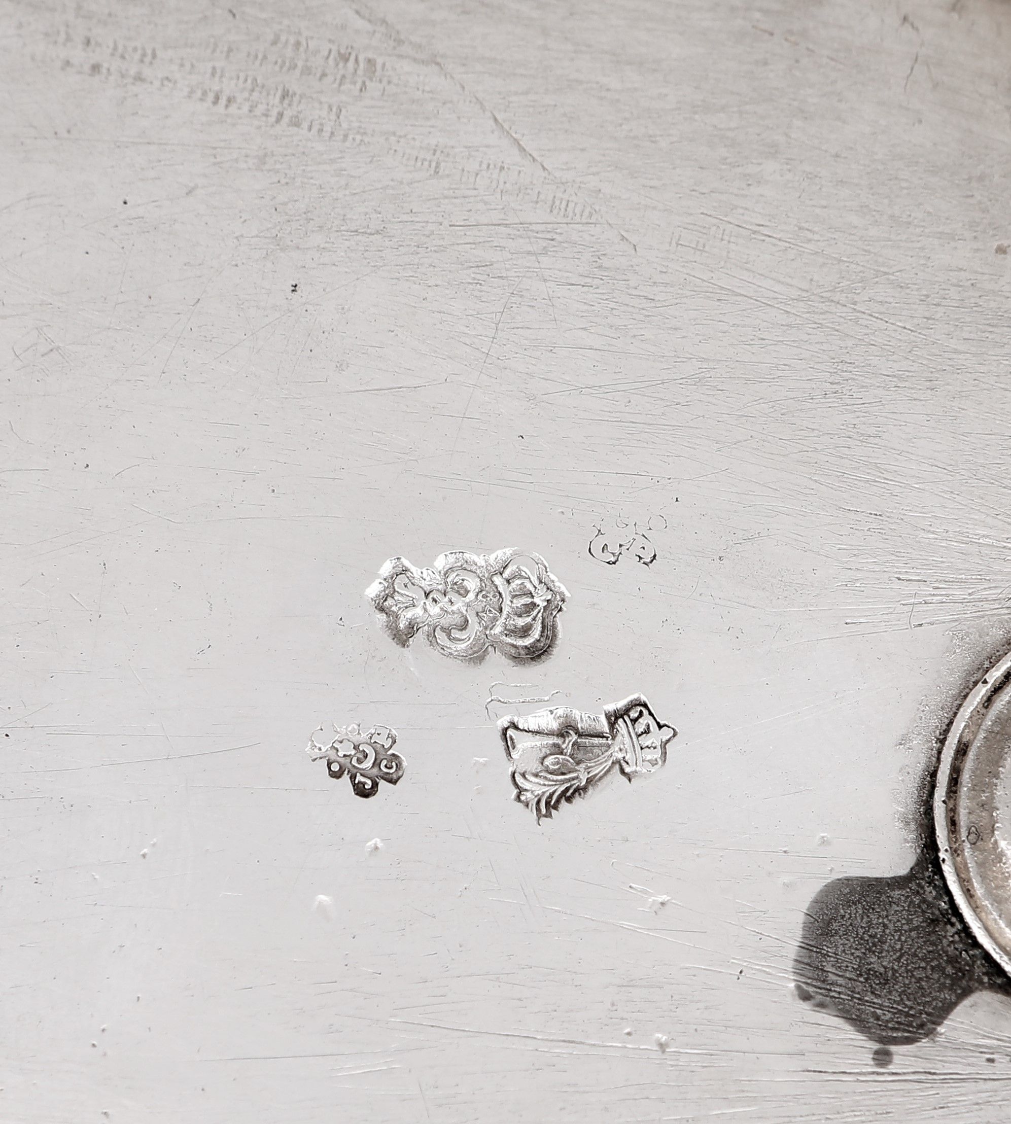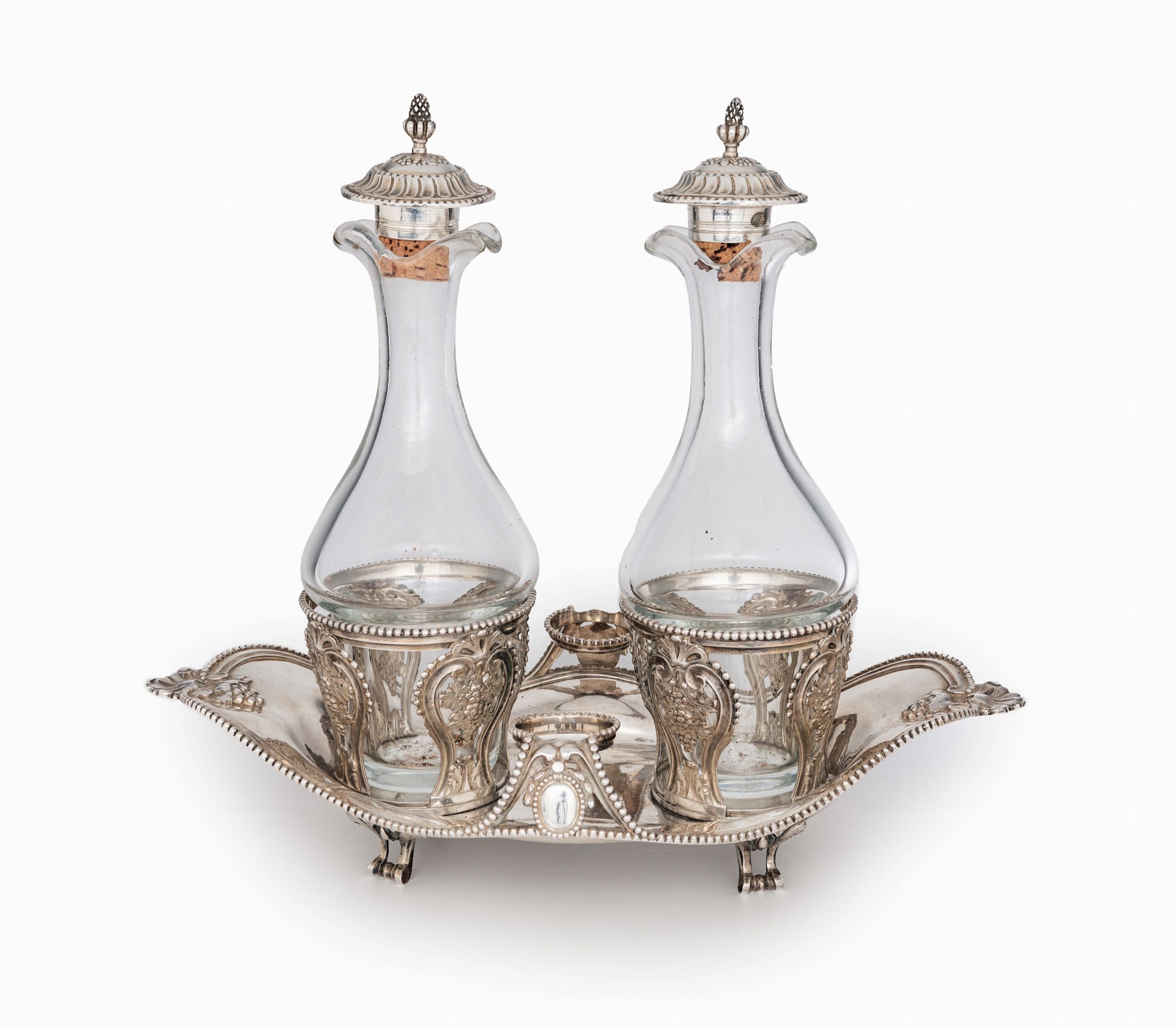 cm 26x30x16 - gr. 700 ca. (esclusi i tappi in sughero) vassoio ovale sagomato con profilo curvilineo sottolineato da perline e vertici ornati da grappoli d'uva e valve; alloggi per flaconi similmente decorati e supporti per i tappi posizionati al centro dei lati; piedi in forma di cartiglio