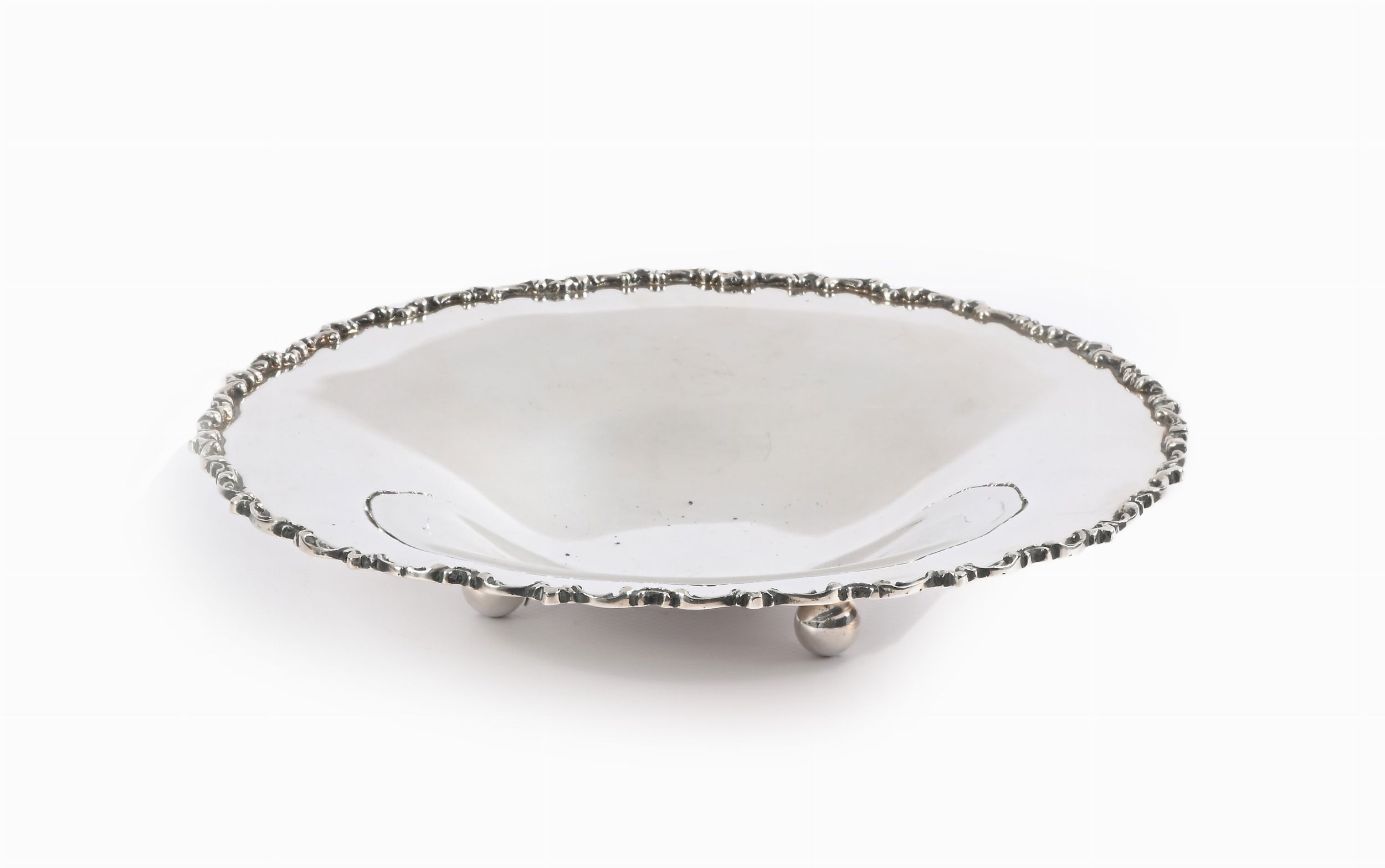 vaschetta circolare poggiante su tre piedini a sfera; orlo sottolineato da volute riportate