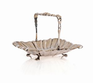 argento sbalzato, cm 27,5x24x11 - gr. 440 sostegno sagomato sorretto da volute, presa centrale a balaustro con [..]