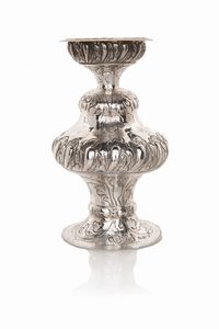 altezza cm 23,5 - gr. 370 corpo a rocchetto con baccelli sbalzati e motivi vegetali incisi, collo a tromba, piede [..]