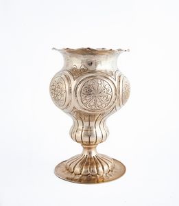 argento 800/000, altezza cm 14,5 - gr. 156 decorato da grandi corolle incise entro motivi circolari; orlo ondulato, [..]