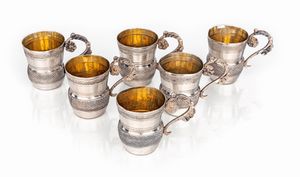 cm 4 - peso complessivo gr. 142 corpo a vaso decorato da due fasce bulinate, manico sagomato con motivi vegetali [..]