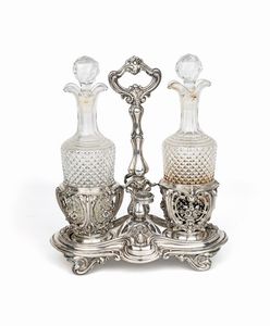 cm 24x17,5x10 - gr. 440 due ampolle in vetro con tappo racchiuse in alloggi traforati a motivi ovali intersecantesi [..]