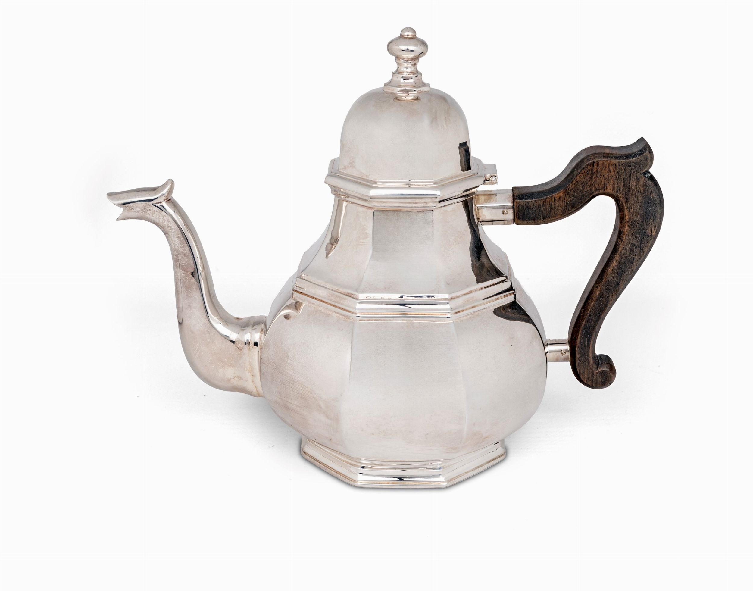corpo sfaccettato a pianta ottagonale, con versatoio sagomato e manico in legno, coperchio a cupolino incernierato sormontato da un pinnacolo