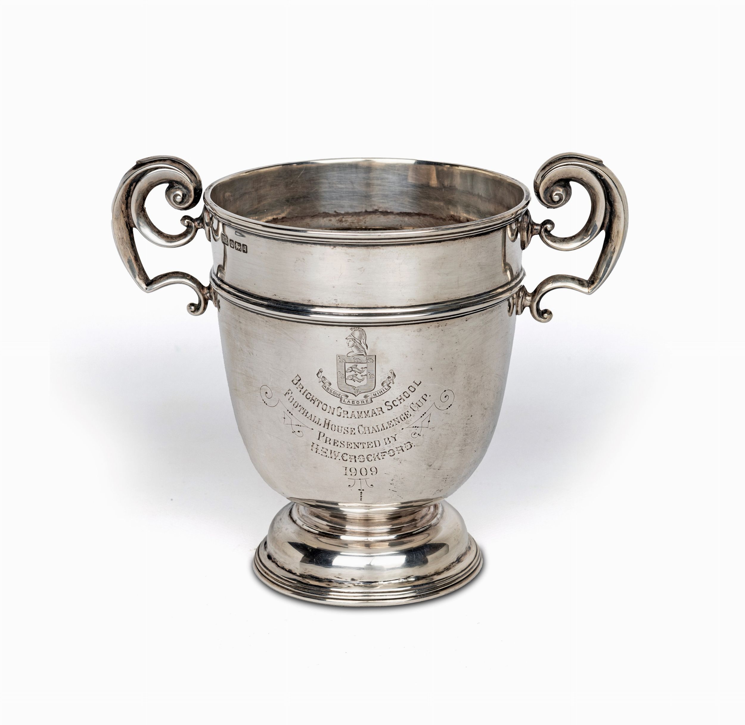 argento, cm 18x21x13,5 - gr. 440 Stemma con cimiero e motto Absque Labore Nihil e dedica incisa Brighton Grammar School Football House Challenger Cup, Presented by H.E.W. Chockford 1909