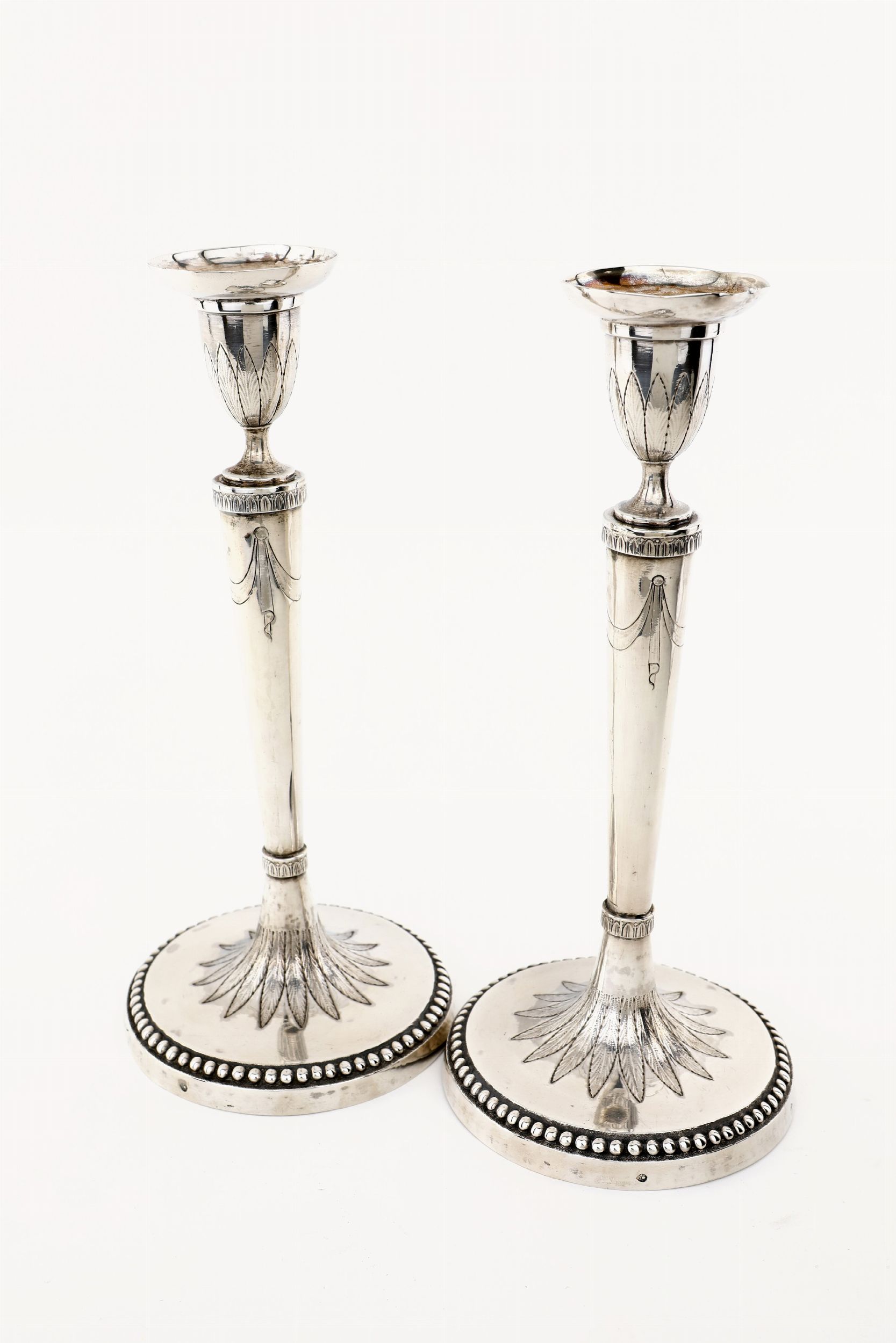 altezza cm 27 - gr. 522 fusto rastremato liscio decorato sulla sommità da drappeggi incisi e alla base da foglie lanceolate, elemento decorativo ripreso intorno al portacandela; piede circolare con profilo perlinato