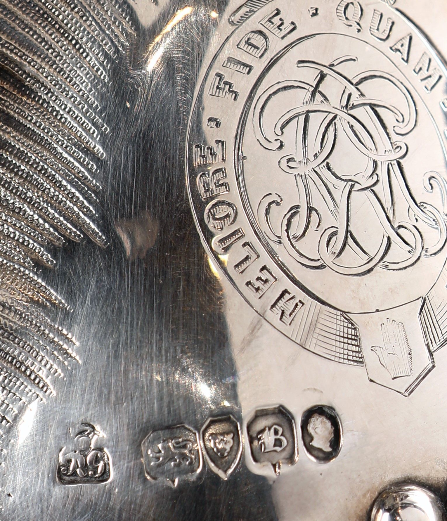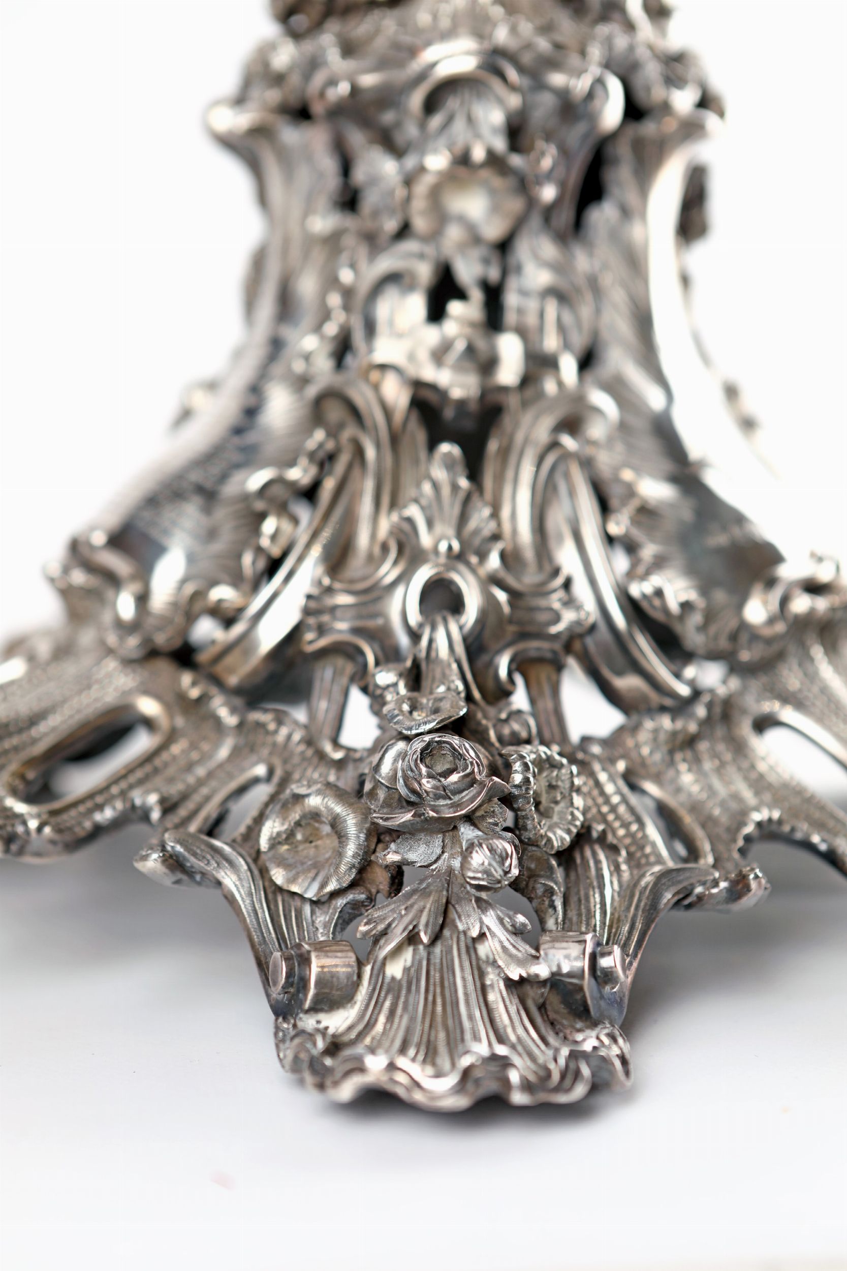 cm 77x50 - gr. 9100 braccia sagomate ornate da rilievi vegetali, disposte su due palchi di cui quello superiore idealmente sospeso e sorretto da elementi incurvati; fiamma centrale e reggicandele a vaso incluso in una campanula con petali frastagliati; ampia base di impianto trilobato con orlo arricchito da lambrecchini sollevati, abbellita da cartigli applicati in fusione decorati da iscrizione, stemma araldico e iniziali incise con motto latino Meliore Fide Quam Fortuna (meglio la Fede che la Fortuna); applicazioni in fusione sulla base in forma di cascatelle fiorite; piedi a valva