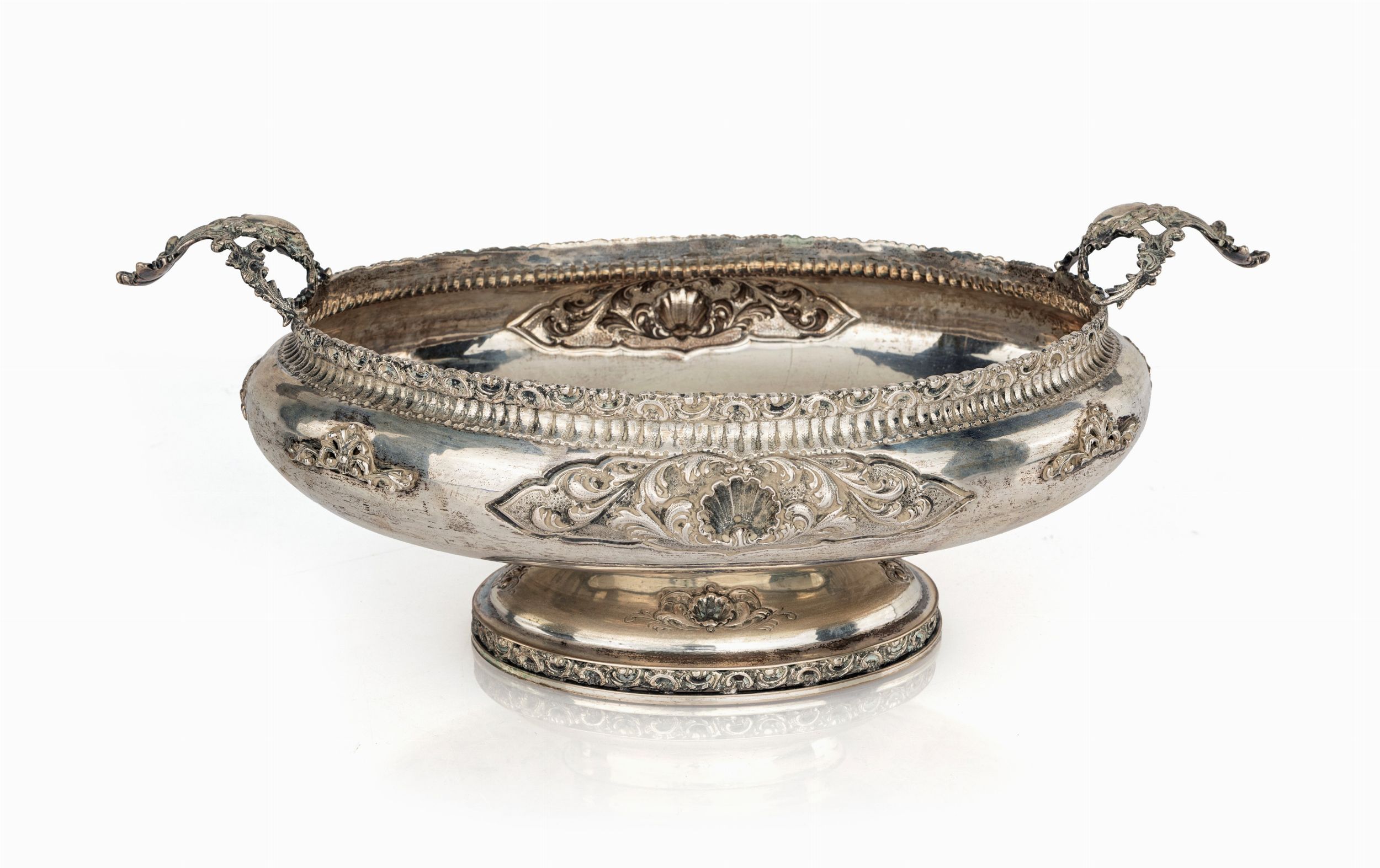 decorata da riserve centrate da conchiglia circondata da motivi vegetali sbalzati, motivi decorativi ripresi sul piede; anse fuse in forma di cartiglio arcuato congiunto all'orlo da motivi vegetali