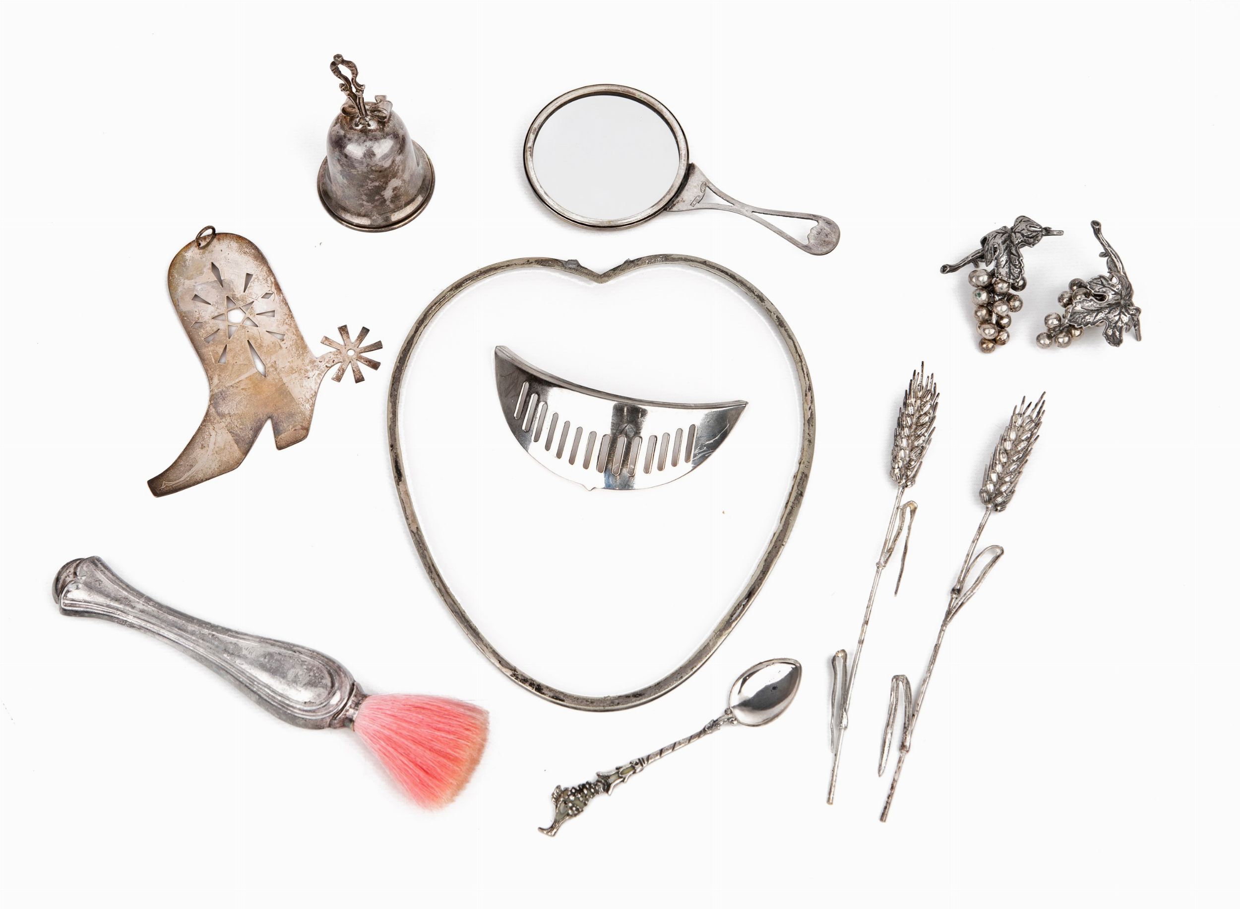 peso complessivo lordo gr. 200 una campanella con fiocco applicato, un pennello da trucco con setole rosa, uno specchietto circolare con impugnatura incisa, un cucchiaino da caffè con grappolo d'uva, un pendente natalizio a forma di stivale con sperone, due spighe di grano, due grappoli d'uva e due frammenti