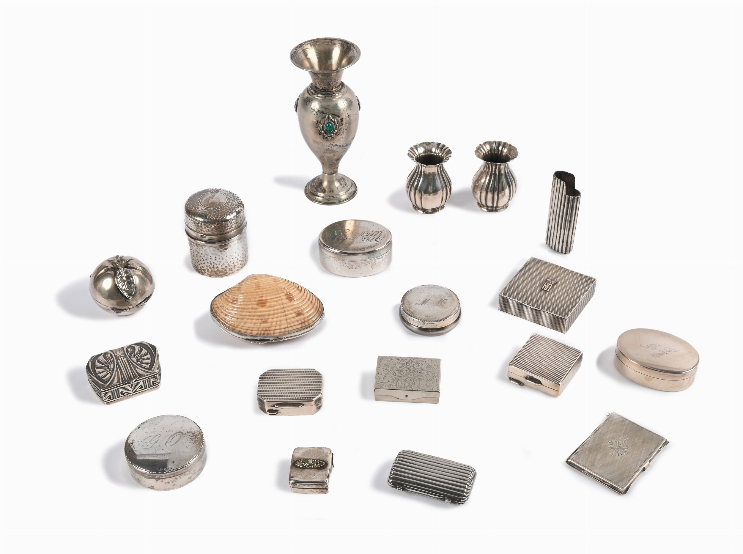 peso complessivo gr. 450 coppia di vasetti percorsi da sottili nervature (altezza cm 4,5); anforetta con tre gemme cabochon (altezza cm 12); tredici portapillole (fogge e misure diverse) ed uno composto da conchiglia (cm 7,5x5); un copri accendino da tasca modello bic ed un piccolo portafoto a libretto