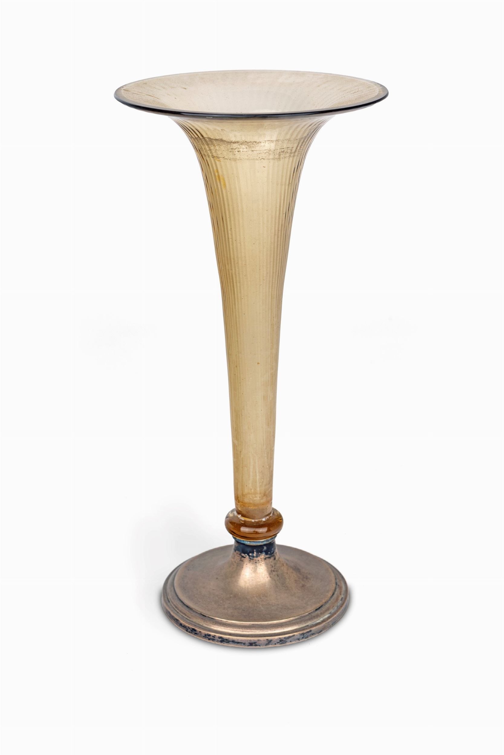 lungo stelo cavo con sommità a campana, piede circolare in argento 800/000 con anello di raccordo in vetro paglierino