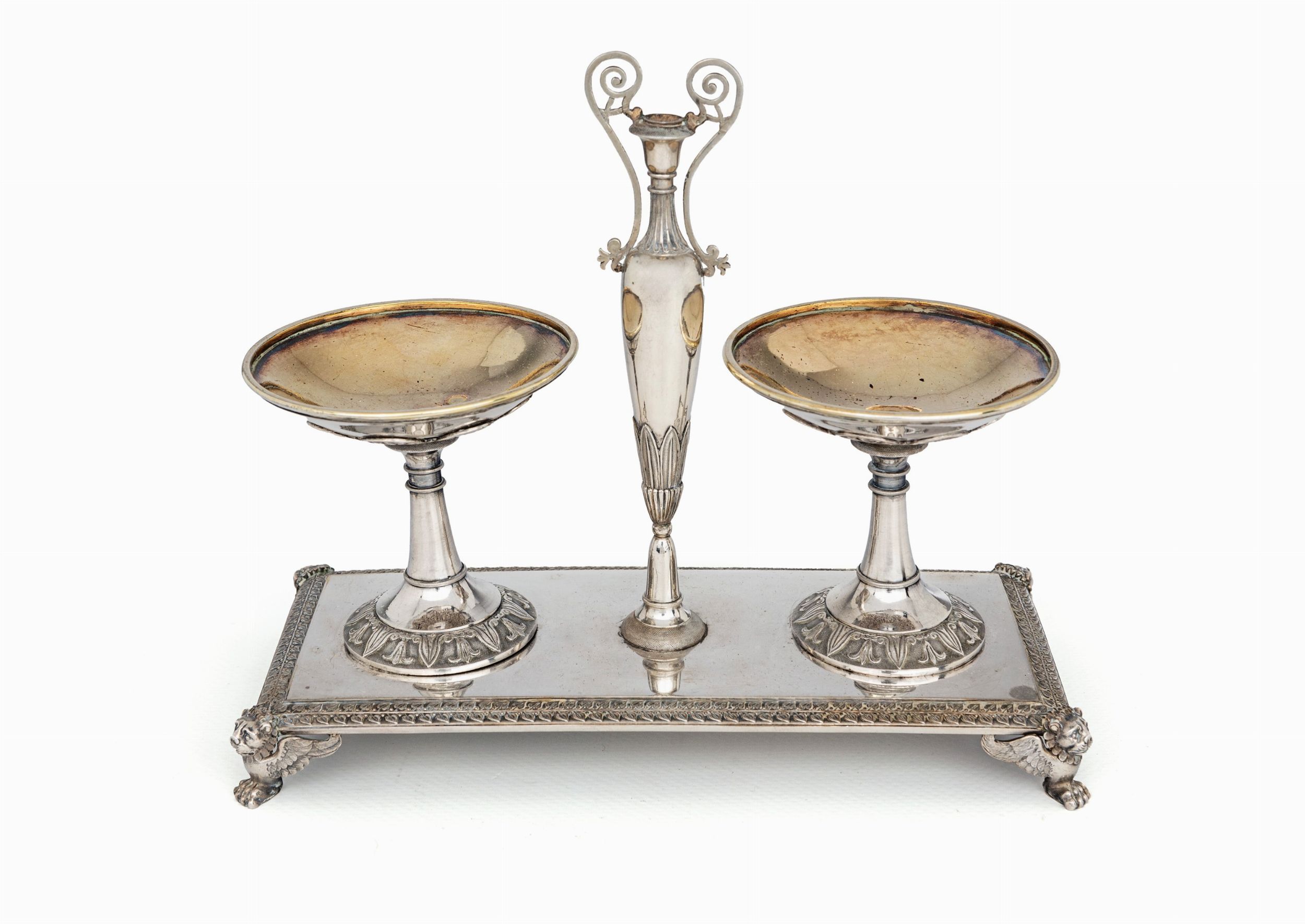 cm 16x18,5x8 - gr. 430 supporto rettangolare con profilo segnato da un lungo serto fogliaceo sorretto da figure angolari di leone alato, presa centrale in forma di vaso classico ai lati del quale sono disposte due alzatine circolari con vaschetta dorata internamente, abbellite da palmette cesellate