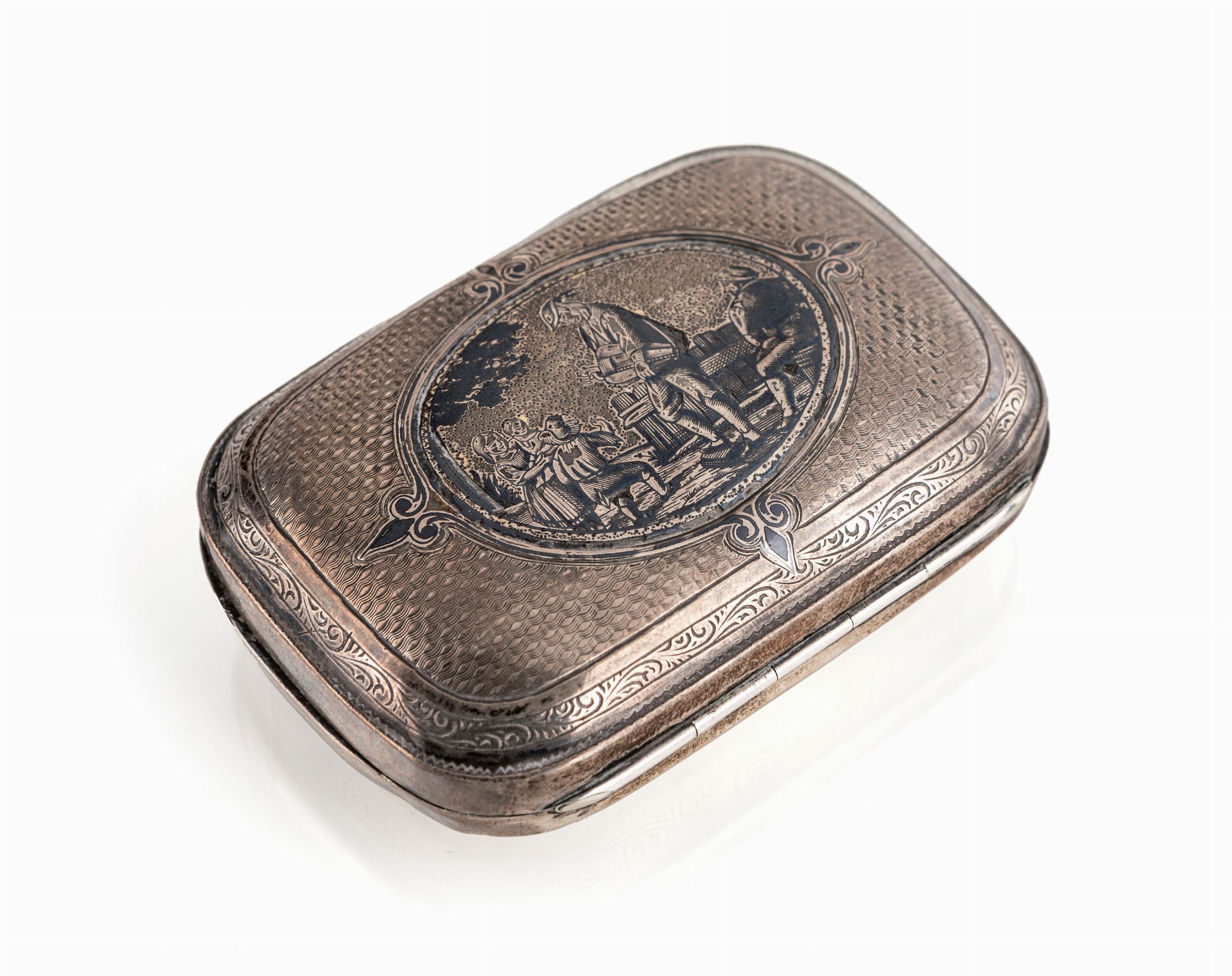 Scatola portatabacco in argento niellato e bulinato, Gran Bretagna, XIX secolo