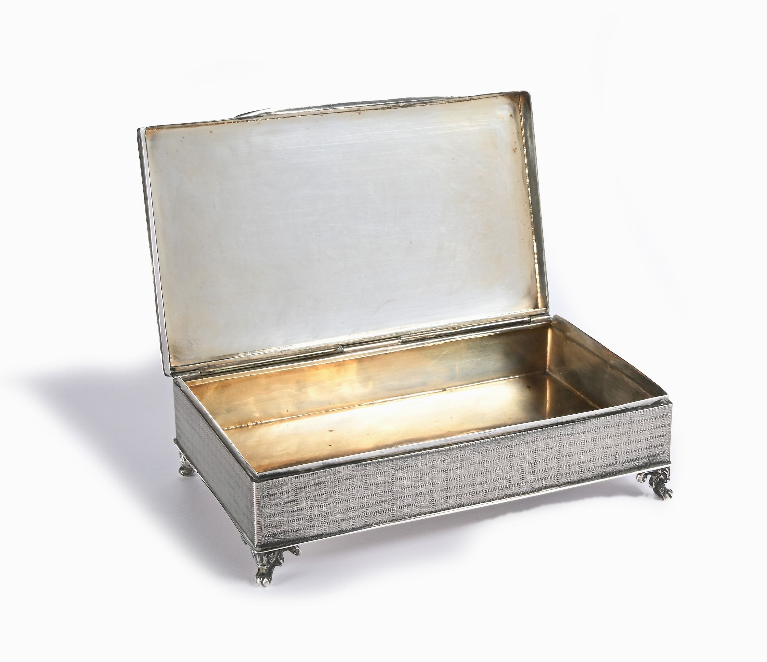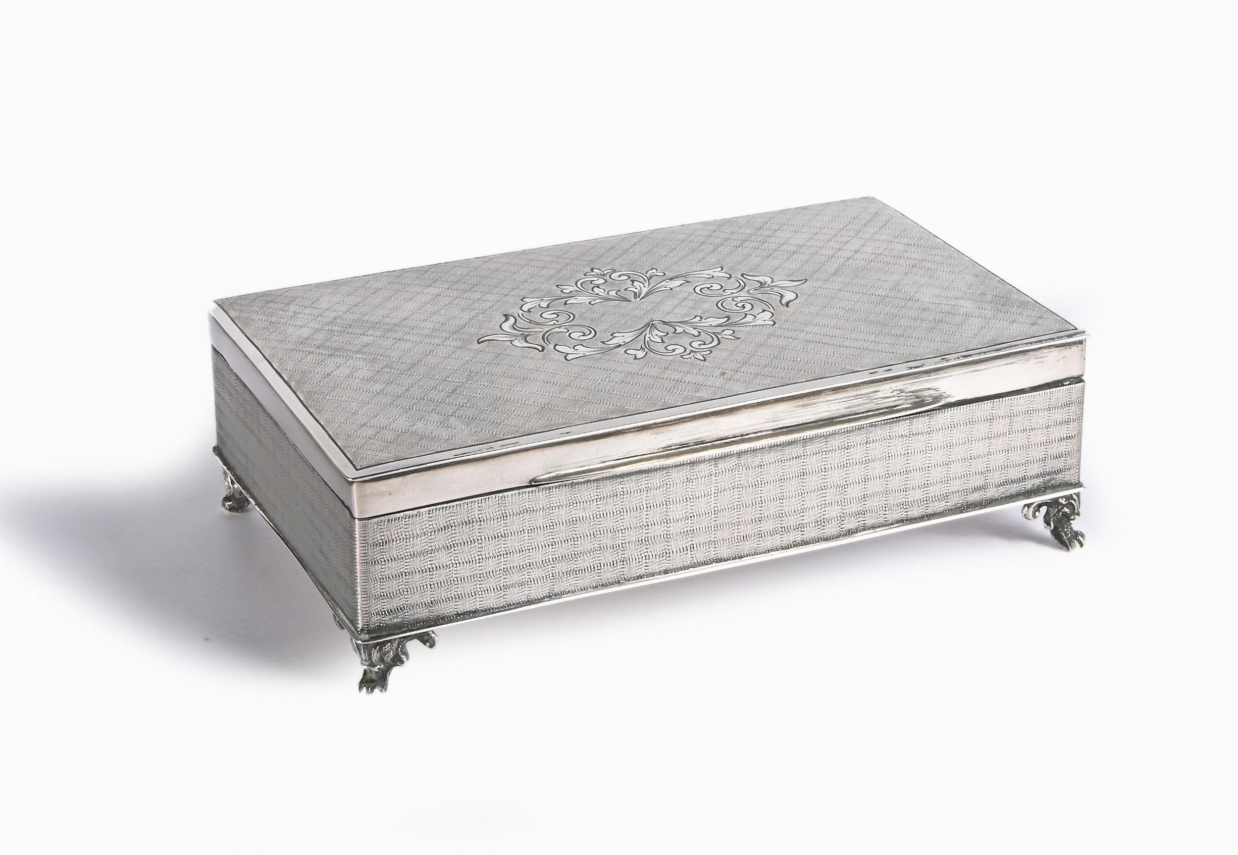 Scatola rettangolare in argento satinato con motivi vegetali incisi