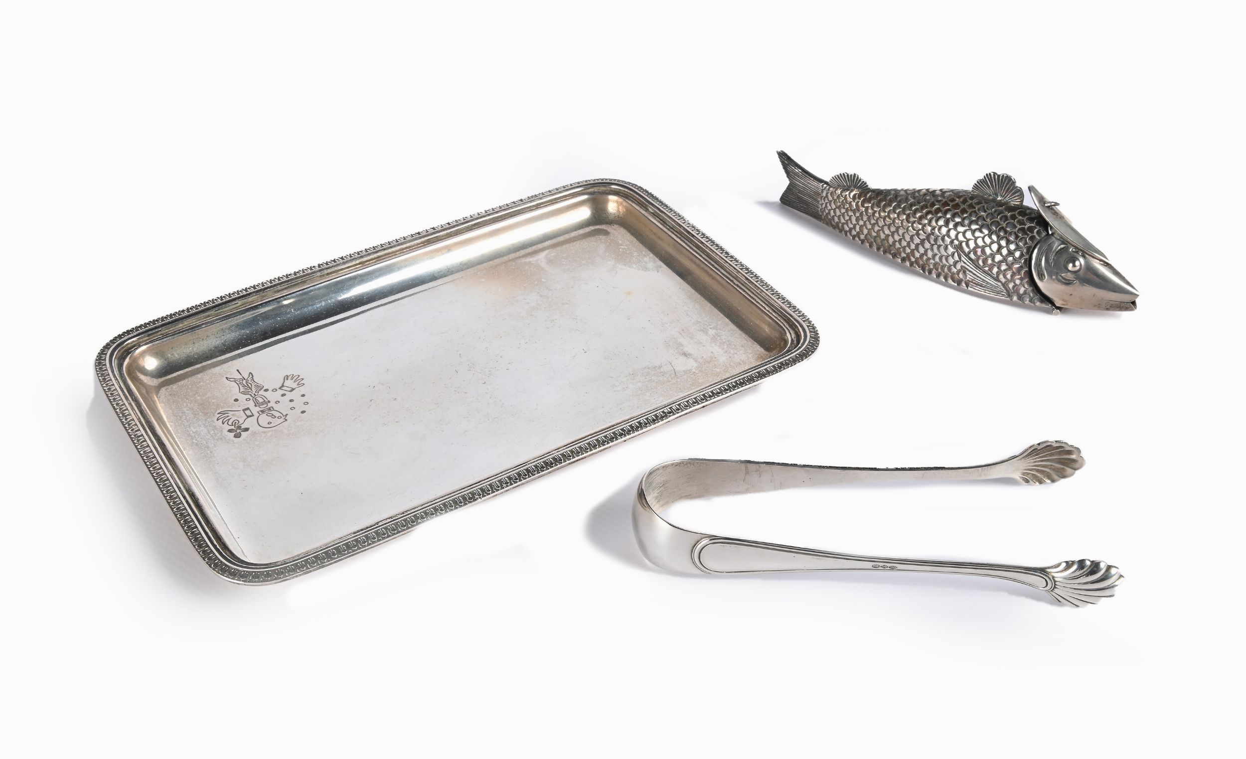 piccolo vassoio rettangolare, R. Miracoli Milano, con angoli arrotondati e profilo a palmette, caratterizzato da un giullare stilizzato inciso; un contenitore a forma di pesce ed una pinza per zollette