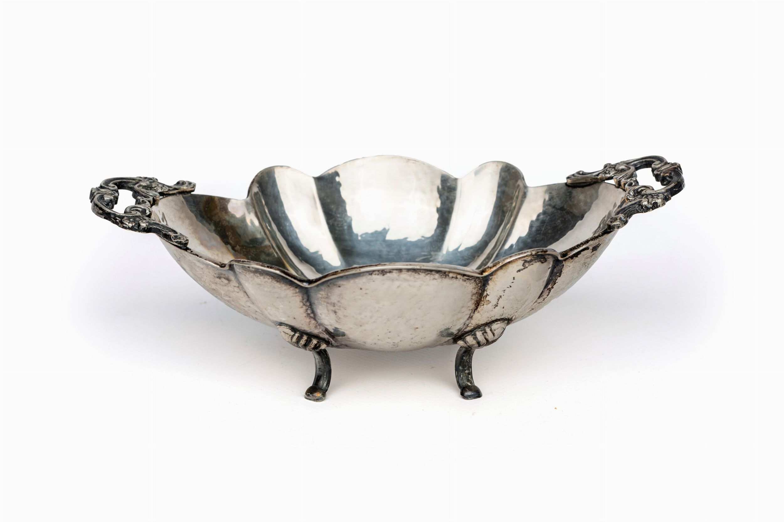 corpo ovale martellato con orlo centinato, manici a volute contrapposte con corolle, piedi arcuati con attacco a palmetta