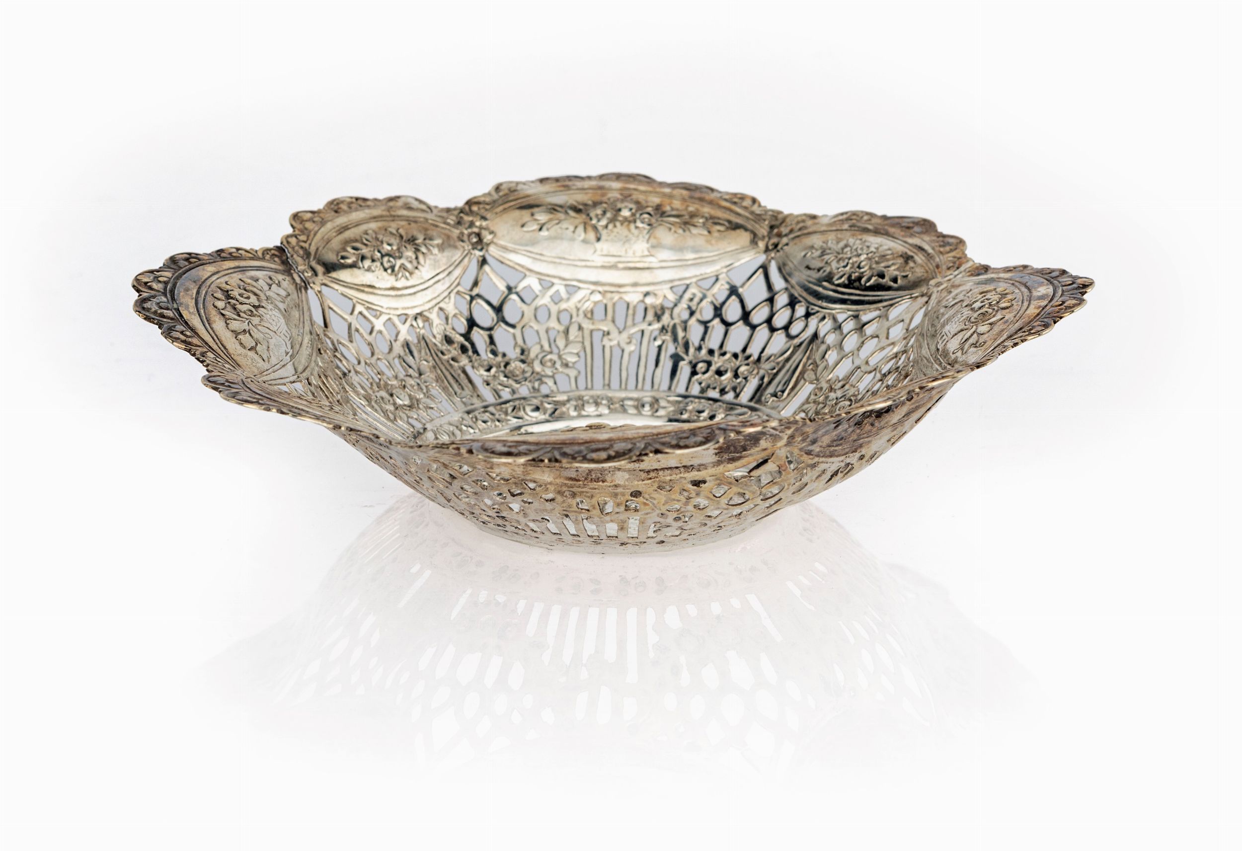 rgento 800/000, cm 4x17 - gr. 138 al centro tre figure di amorino con ghirlande fiorite e architetture sullo sfondo; tesa traforata definita superiormente da otto placchette ovali con composizioni di fiori sbalzate; orlo centinato centrato da corolle