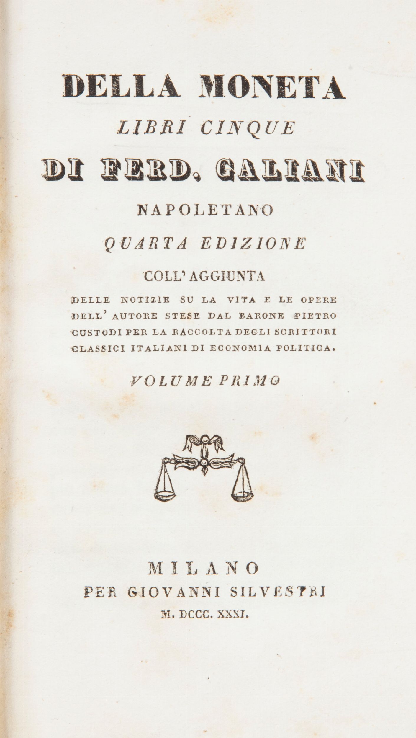 cm 17,5x11 Giovanni Silvestri, Milano 1831 2 volumi rilegati in un tomo. Edizione ottocentesca dell'opera stampata in prima edizione a Napoli nel 1750 (ma 1751), definita il capolavoro uscito dalla discussione sulle monete che vide impegnati alla metà del XVIII secolo molti intellettuali e riformatori dei vari Stati italiani. Famoso per l'ampiezza e l'organicità della trattazione, per le chiare e lucide definizioni dei concetti economici di base, come il valore dei beni, e per l'originalità del suo pensiero rispetto al problema delle manipolazioni monetarie. Legatura in mezza pelle con angoli in pelle e titolo e fregi in oro al dorso.