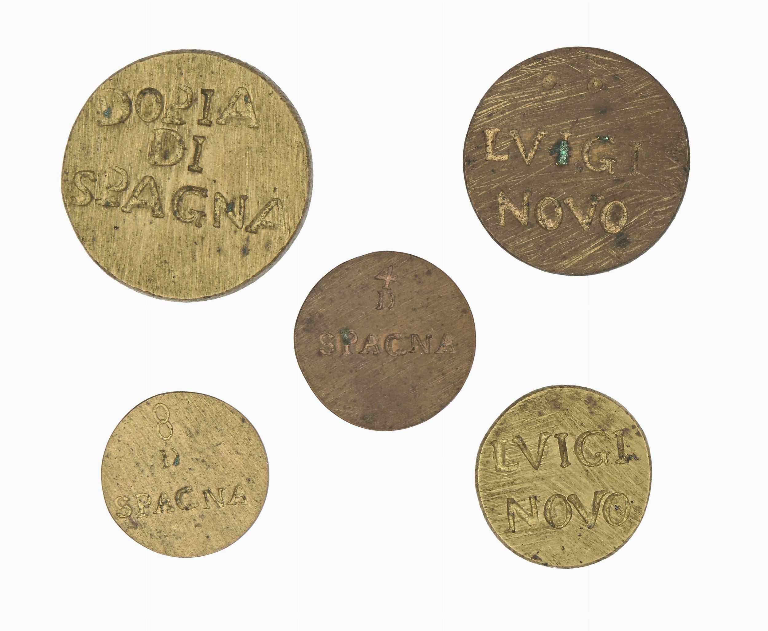 Doppia di Spagna; Luigi novo (2); 1/4 di Spagna; 1/8 di Spagna.