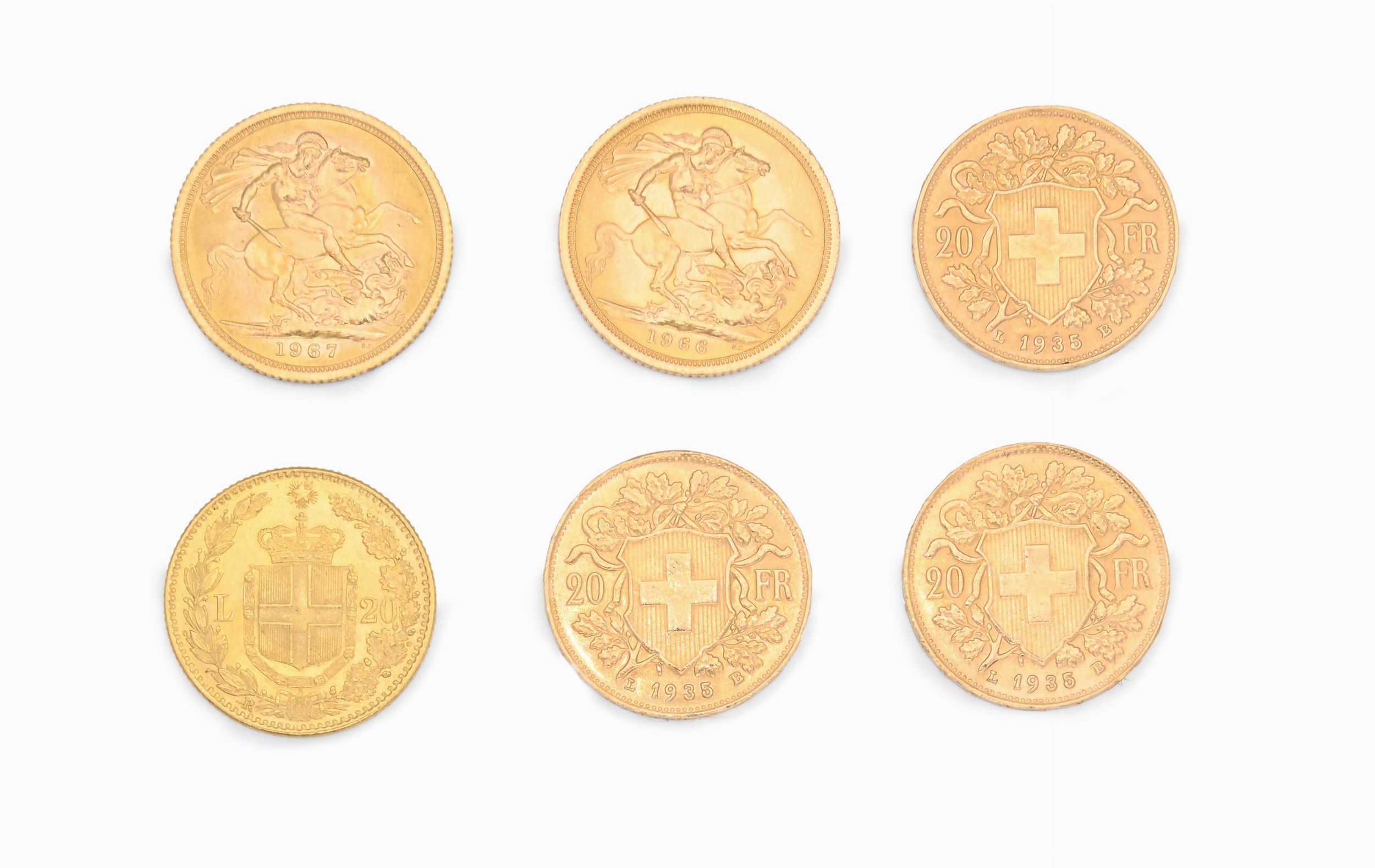 Lotto di 6 monete: 20 lire 1882 Regno d'Italia Umberto I; 3 da 20 franchi 1935 Svizzera; [..]